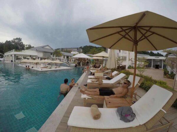 我重新下了锚,吃过午饭休息了一会放下了小艇。下午我们开着小艇上了沙滩,在沙滩旁的一间酒店享受了一个下午的无边泳池,欣赏了著名的珍浪Beach的夕阳美景,日落之后我们才返回船上。
